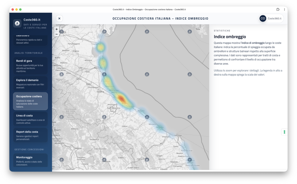 Le analisi sviluppate da Coste360.it attraverso immagini satellitari e dati territoriali permettono però di osservare la distribuzione delle aree di ombreggio lungo la costa italiana, offrendo una visione più completa dell’occupazione delle spiagge.
